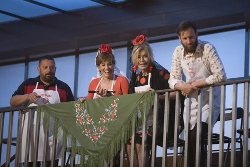Pepón Nieto, Anabel Alonso, Bibiana Fernández y Edu Soto, vestidos de sevillanos, ven cocinar a sus compañeros de 'MasterChef Celebrity 2'.