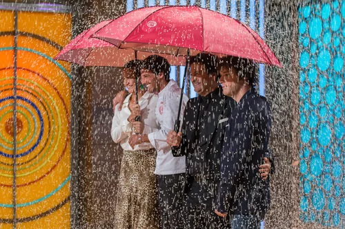 El jurado y Jorge Brazalez con paraguas bajo una lluvia de arroz en 'MasterChef Junior 5'
