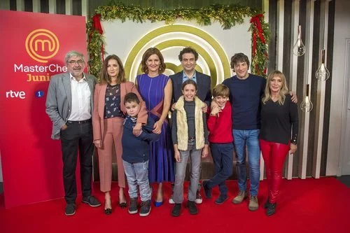 Foto de familia de 'MasterChef Junior 7' con el jurado, compuesto por Samantha Vallejo-Nágera, Pepe Rodríguez y Jordi Cruz; tres de los aspirantes: Albert, Lu y Juan; y, los responsables de la producción del formato: Macarena Rey (CEO de Shine iberia), Toñi Prieto (directora de entretenimiento de TVE) y Fernando López-Puig (director de contenidos, canales y producción de programas de TVE).