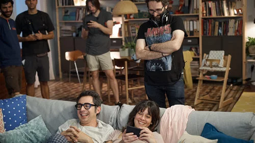 Berto Romero (Berto) y Eva Ugarte (Sandra) se ríen sentados en el sofá durante el rodaje de 'Mira lo que has hecho'.