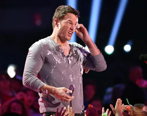 El actor Chris Pratt hablando manchado en el escenario de los Nickelodeon's 28th Annual Kids' Choice Awards en California.