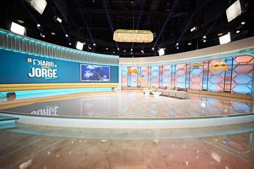 En esta vista del plató se aprecia el espacio principal, donde se encuentra la pantalla y el sofá para los invitados.