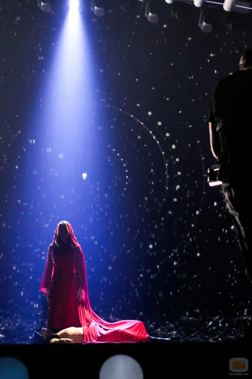 La representante de España con una luz tenue y capucha en su entrada al escenario durante los ensayos en Viena.