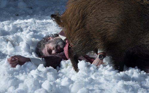 Leonardo Sbaraglia tumbado en la nieve y tapado por un animal en 'Félix'