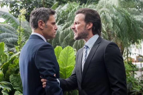 El personaje de Daniel Grao en 'Gigantes' agarra fuerte el brazo de un hombre mientras mantienen una acalorada discusión en la ficción de Movistar+.