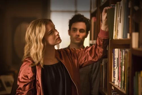 Fotograma de la serie de Netflix 'YOU'. Joe observa discretamente a Beck mientras ojea unos libros de la librería donde trabaja Joe.