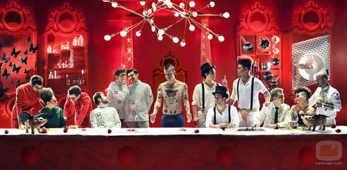 El cocinero poseedor de tres estrellas Michelín, Dabiz Muñoz, preside una mesa simulando "La última cena" de Jesús con sus 12 apóstoles.