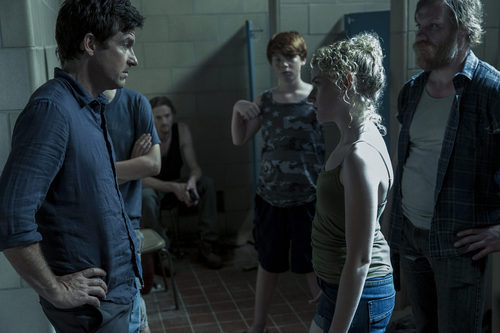 Marty Byrde (Jason Bateman) habla con una joven mientras otros tres individuos les observan en una fotografía promocional de 'Ozark'.