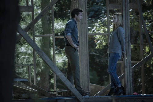 Marty Bryde habla con su mujer Wendy, que permanece apoyada en una viga, durante un episodio de 'Ozark', nueva serie de Netflix.