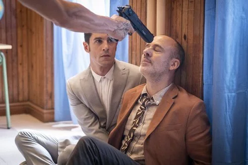 Alejo Sauras interpreta a 'El enlace' y Javier Gutiérrez encarna a Márquez, a quien están apuntando con la pistola en un fotograma de la segunda temporada de 'Estoy vivo'.