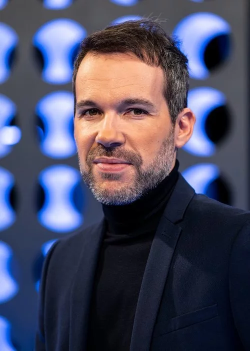 Posado en primer plano de Javier Gómez Muñoz, el periodista y presentador del programa 'Turno de palabra', el nuevo programa de Telemadrid.