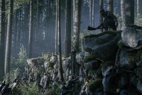 Escena de la serie futurista y post-apocalíptica 'See', emitida en Apple TV+, donde Jason Momoa está en un bosque.