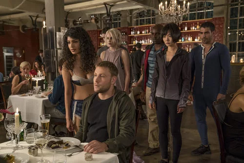 Todos los personajes de la serie miran al comensal de Wolfgang Bogdanow en un capítulo de la segunda temporada de 'Sense8'.