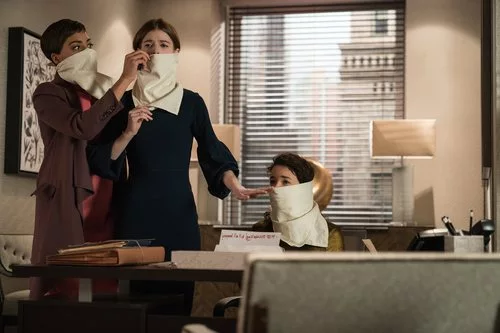 Las tres actrices se tapan la boca y la nariz con una tele blanca en una escena de la segunda temporada de 'The Good Fight'.