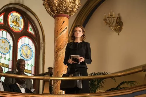 El personaje de Rose Leslie mira desde un palco de una iglesia en un escena de la nueva temporada de 'The Good Fight'.