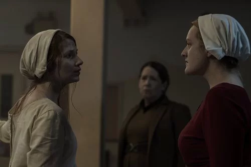 Offred, la protagonista de la ficción de HBO interpretada por Elisabeth Moss, habla con otra criada en una secuencia de la segunda temporada de la serie.
