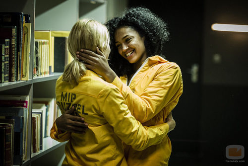 (2x04) Macarena Ferreiro (Maggie Civantos) aparece en actitud cariñosa con Rizos (Berta Vázquez) mientras se abrazan.
