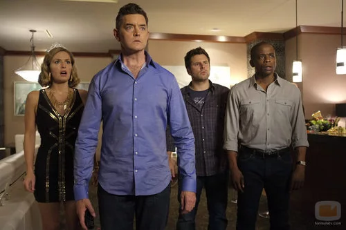 Juliet (Maggie lawson), Lassiter (Timothy Omundson), Shawn (James Roday) y Gus (Dulé Hill) sorprendidos en una escena de la séptima temporada de 'Psych'.