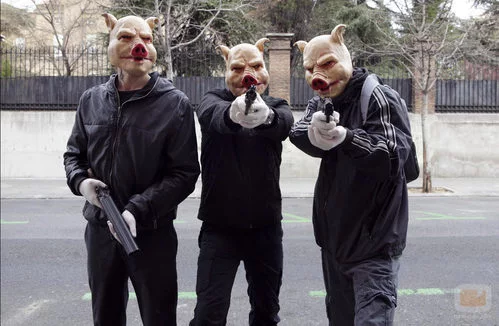 Imagen de los actores con máscaras de cerdo y armas, para el capítulo de 'Cuéntame un cuento': Los tres cerditos.