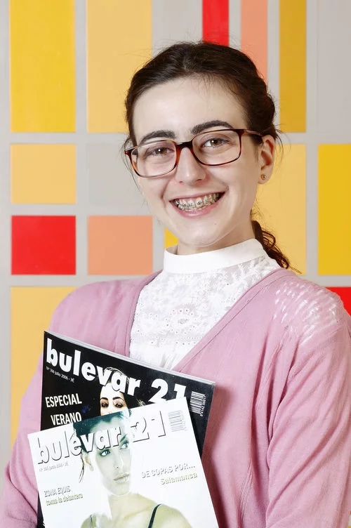 La actriz Ruth Núñez se encuentra caracterizada como Bea junto a dos revistas Bulevar 21, en la serie 'Yo soy Bea'.