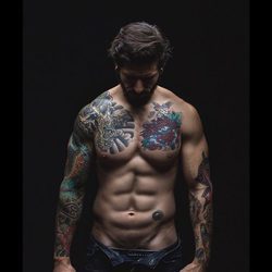 Daniel G. Prim, sin camiseta, practicando con unas anillas