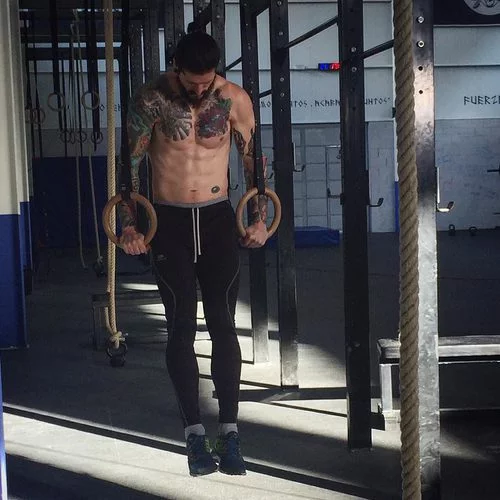 Daniel G. Prim, sin camiseta, practicando con unas anillas