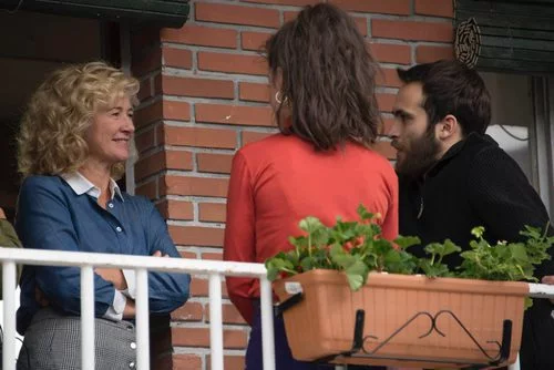 Mercedes, Karina y Carlos hablan sobre algo en el balcón en las primeras imágenes del rodaje de la nueva temporada de 'Cuéntame cómo pasó'.