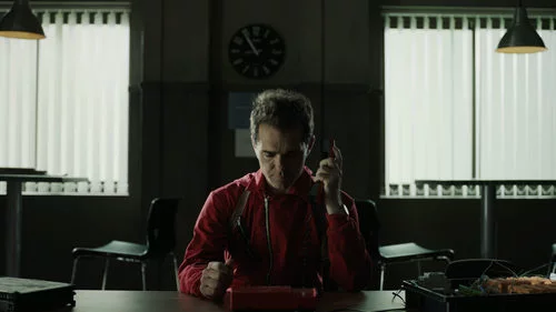 Berlín, interpretado por Pedro Alonso, llama desde el teléfono rojo en la Fábrica Nacional de Moneda y Timbre, desde donde llaman al profesor.