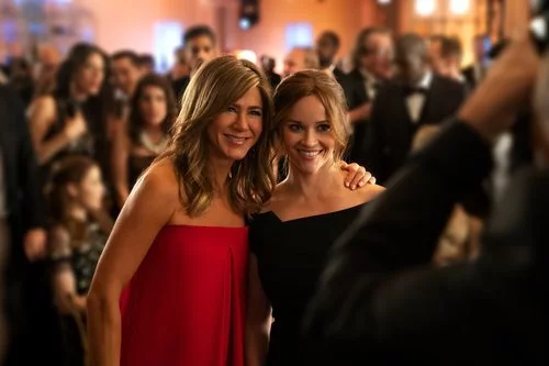 Los personajes de Jennifer Aniston y Reese Witherspoon acuden a un evento de gala donde posan frente a un fotógrafo.