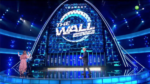 Una de las imágenes de 'The Wall: Cambia tu vida' en las que se ve a Carlos Sobera con una de las concursantes durante una de las preguntas.