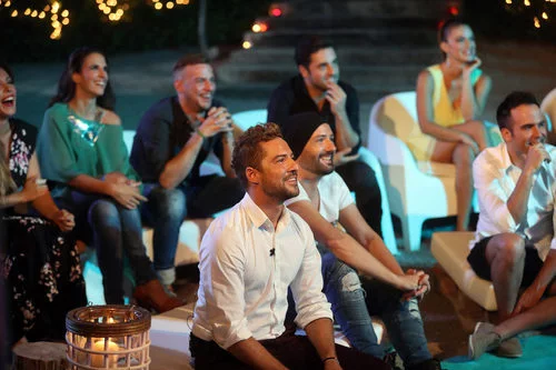 Muchos triunfitos con Alejandro Parreño y David Bisbal en primer plano, sonriendo mientras observan emocionados al frente.