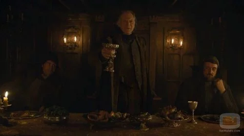 (6x10) El viejo Walder Frey (David Bradley) celebra los últimos acontecimientos en Aguasdulces junto a los soldados de Jaime Lannister en 'Juego de tronos'.
