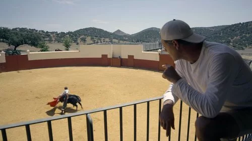 Un torero se entrena toreando a una vaquilla mientras Frank Cuesta explica lo que ve para el documental 'Wild Frank: Toros'.