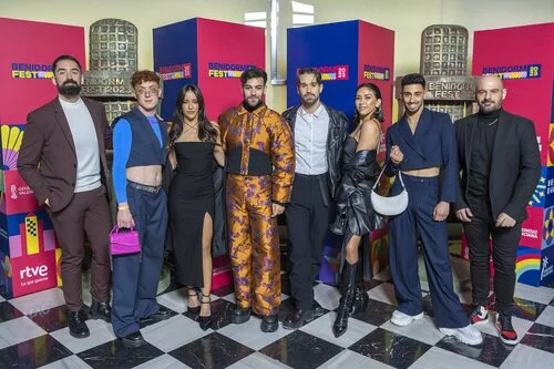 Posado de Agoney y su equipo, en la inauguración del Benidorm Fest 2023