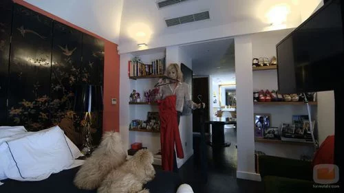 (1x25) Bibiana Fernández no sabe si elegir un vestido rojo o negro bajo la atenta mirada de sus dos mascotas en 'En la tuya o en la mía', espacio conducido por Bertín Osborne