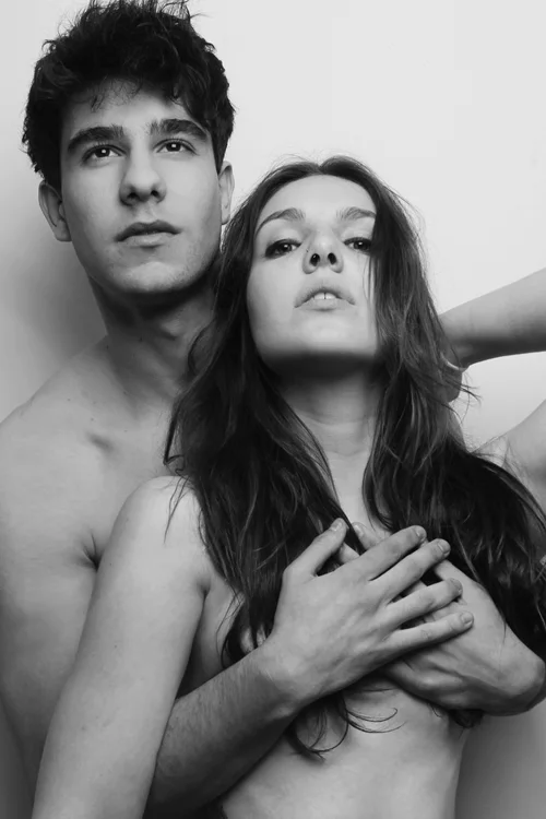 El actor Javier Calvo semidesnudo junto a una modelo posa para Overlay Magazine