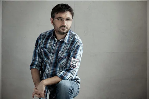 Jordi Évole posa apoyándose en su rodilla para la promoción de la séptima temporada del programa 'Salvados'.