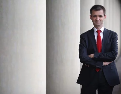 José Pablo López, el director de Telemadrid, posa junto a varias columnas durante la sesión de fotos de la toma de cargo.