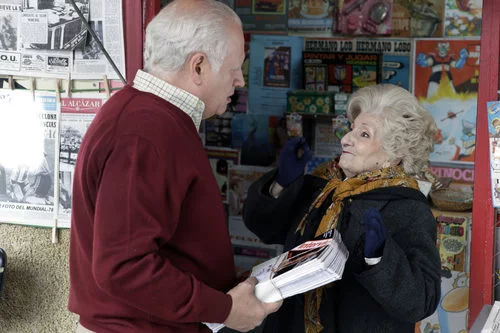 Los personajes de Miguel y Sagrario en el kiosco del barrio de San Genaro en la serie de RTVE y Grupo Ganga.