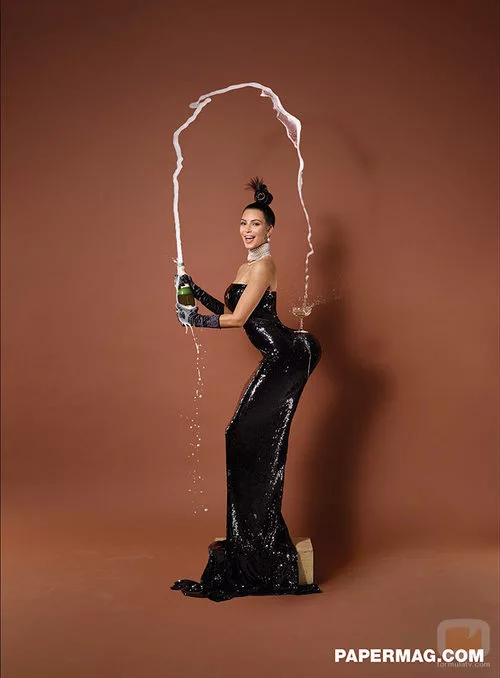 La celebrity Kim Kardashian sostiene una copa con su trasero mientras descorcha una botella de champán en el número de invierno de la revista Paper.