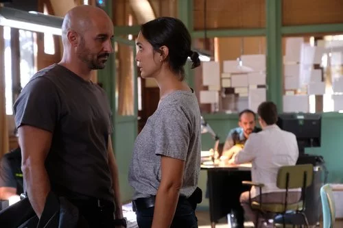 Los agentes, Sara Campos (Megan Montaner) y Víctor Gamero (Alain Hernández) se enfrentan en 'La caza. Tramuntana'.