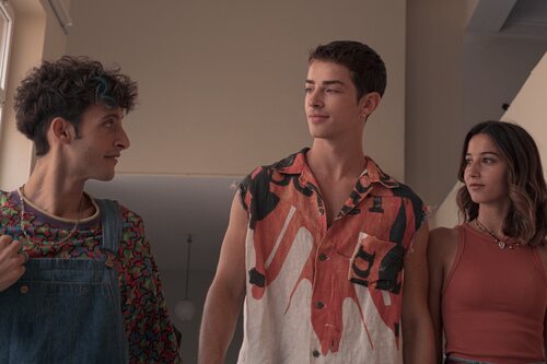 Manu Ríos pasea junto a Amaia Aberasturi en 'La edad de la ira' mientras sonríen a Daniel Ibáñez en uno de los capítulos.