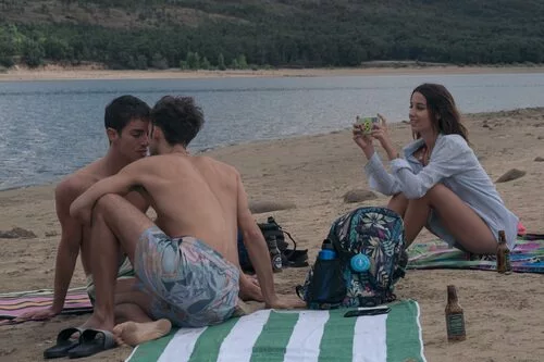Manu Ríos (Marcos) y Daniel Ibañez (Raúl), a punto de besarse durante una escena de 'La edad de la Ira' con Sandra (Amaia Aberasturi) al fondo