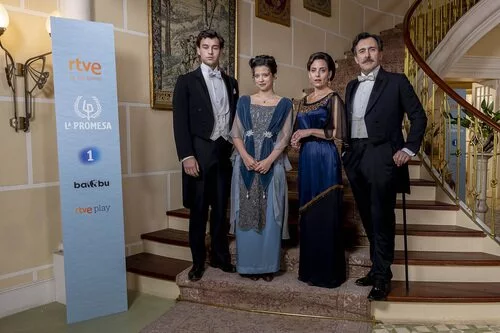 Los actores Xavi Lock, Amparo Piñero, Cristina Fernández y Miquel García Borda caracterizados como sus personajes de 'La promesa' Curro, Martina, Margarita e Ignacio.