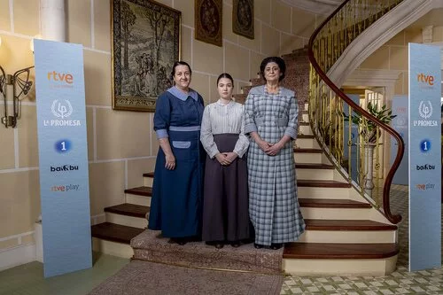 Las actrices Carmen Flores, Laura Lafuente y Teresa Quintero caracterizadas como sus personajes de la serie 'La promesa' Simona, Virtudes y Candela.