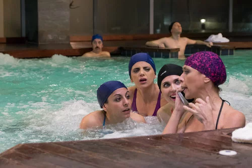 Nines, Lola, Raquel están atentas a la llamada que está atendiendo Maite dentro de la piscina del hotel donde están hospedadas.