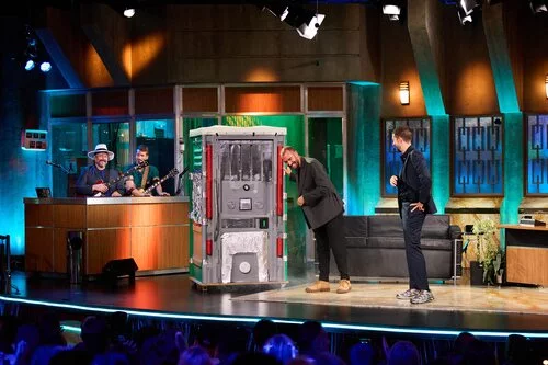 El equipo titular de 'La revuelta' con una máquina del tiempo