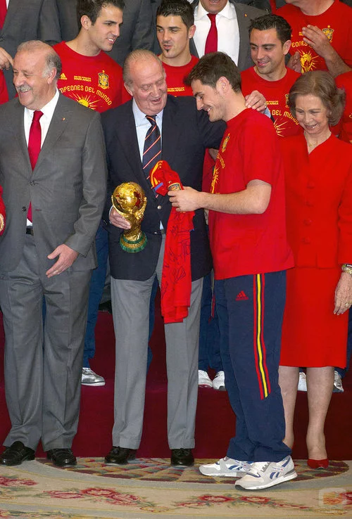 El Rey Juan Carlos I sostiene la Copa del Mundo mientras Íker Casillas le regala una camiseta firmada por los jugadores.