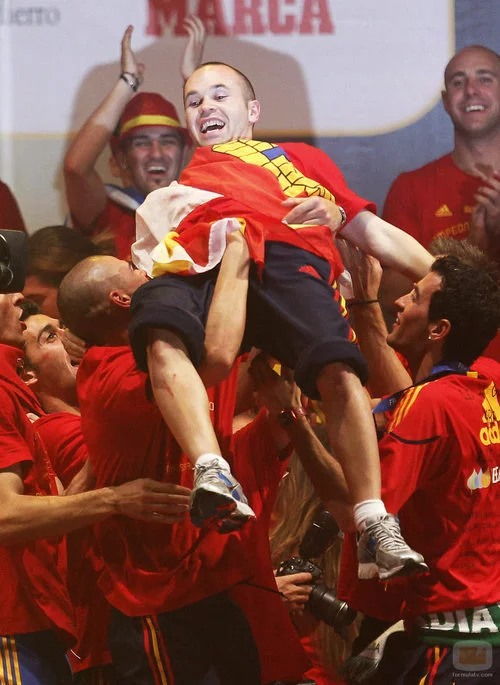 Andrés Iniesta, manteado durante la celebración del triunfo de España en el Mundial de Sudáfrica 2010.