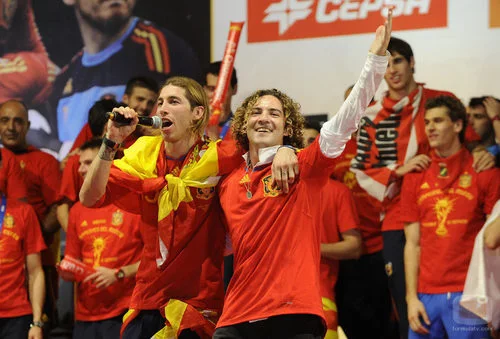 El jugador de la Selección Española junto a David Bisbal durante la celebración de España como Campeona del Mundo en Madrid.
